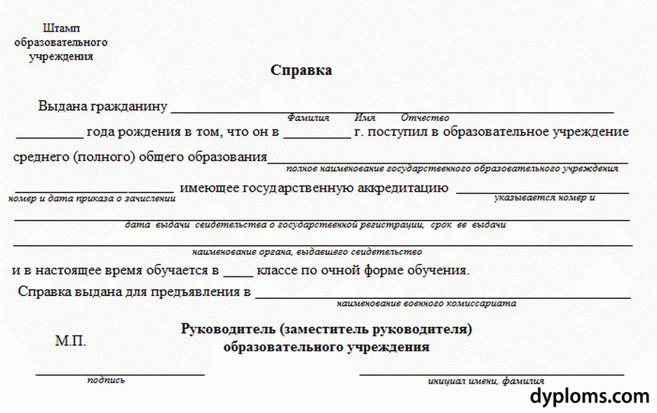 Но выход из сложившейся ситуации есть! Можно просто заказать справку для военкомата, обратившись в проверенную временем компанию, квалифицированные специалисты которой все сделают на высочайшем уровне!  приобрести справку для военкомата, значит, исключить из своей жизни ненужные проблемы. Кстати, легче всего оформить акт о том, что Вы учащийся на стационаре ВУЗа. Подобный документ предоставляет отсрочку от службы на весь период учебы в высшем учебном заведении.